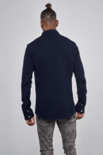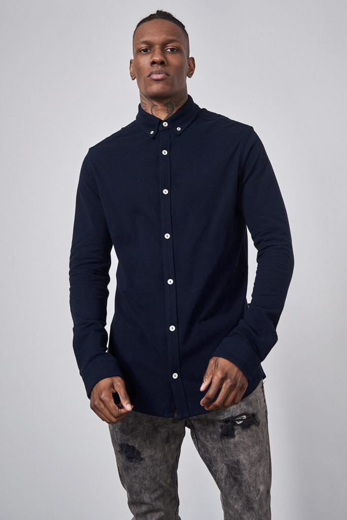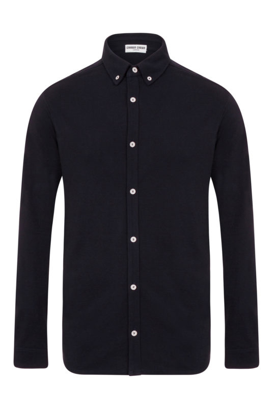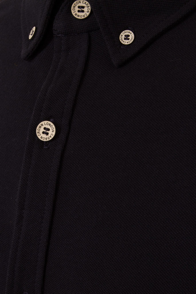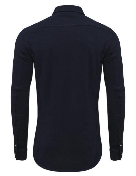 Navy blue long sleeve shirt. Medium weight cotton pique knitted in Italy, excellent natural streach. Slim fit cut, natural white buttons with engraved logo. Made in London.